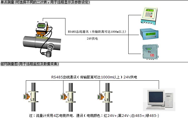 一次表與二次表(或計算機)之間采用RS-485總線通訊,采用普通電纜即可,傳輸距離可達1000米以上,組網十分方便、快捷。這種傳輸方式抗干擾能力強,解決了分體式超聲波流量計專用電纜成本高、抗干擾能力差、傳輸距離短等問題。