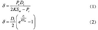作用在筒壁上的工作壓力為50Mpa,設計壓力范圍在0.1Mpa~100Mpa之間,依據中華人民共和國行業標準JB4732-1995(2005年確認)《鋼制壓力容器一分析設計標準》中規定:當設計壓力PC≤0.4KSm時,按公式(1)確定壁厚;當設計壓力PC>0.4KSm時,按公式(2)確定壁厚。