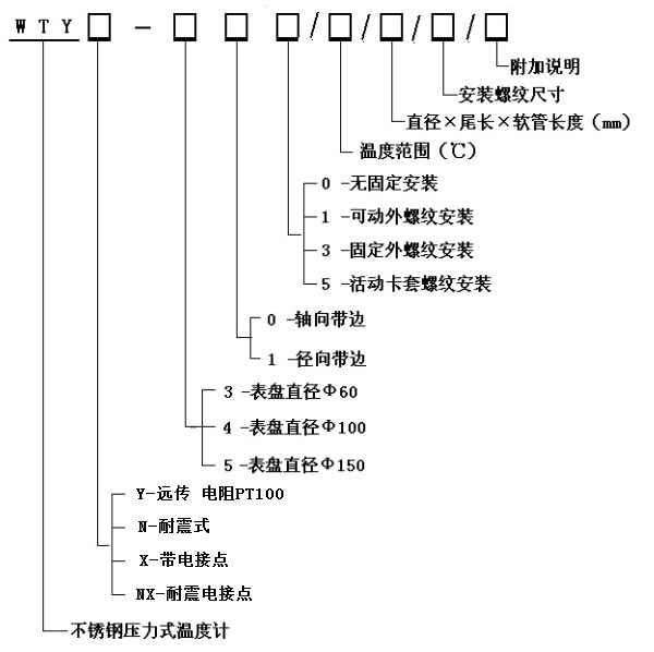 WTY系列全不銹鋼液體壓力式溫度計能顯示被測液體、氣體的溫度。由于其溫包體積小、耐震動、靈敏度高、壽命長、安裝方式多樣等優點,被應用于石油化工、機械、制藥、食品、船舶等生產過程中的檢測和控制。