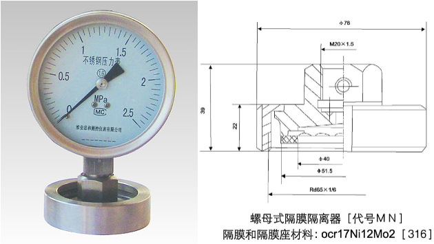 9、MN螺母式衛生型隔膜壓力表:量程上限0.4~2.5MPa