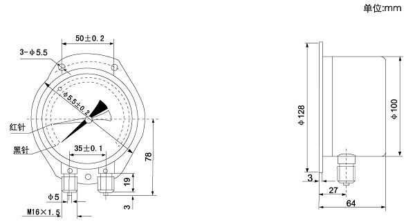 2、雙針壓力表的工作原理是基于彈性元件(測量系統中的彈簧管)的彈性變形。即在被測介質的壓力作用下,迫使兩彈簧管之末端各自產生相應的位移,借助于拉桿經齒輪傳動機構的傳動并予放大,由固定于此輪軸上的紅、黑指針將兩個被測值分別在刻度盤上指示出來。